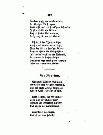 | Keywords: Gedichte Eichendorff (1864) 327.gif  Gedichte_Eichendorff_ 1864 _ gif 328 Der Isegrimm aus Joseph Freiherrn von Eichendorff s sämmtliche Werke 2 Auflage S 327-328 books google com 1864 Joseph von Eichendorff 1788 1857 PD-old Joseph von Eichendorff De Wikisource book leaflet Poetry of Germany |