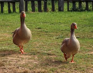Keywords: geese birds goose domestic fowls two birds farms farming walking green lands grasses greenery wildlife poultry