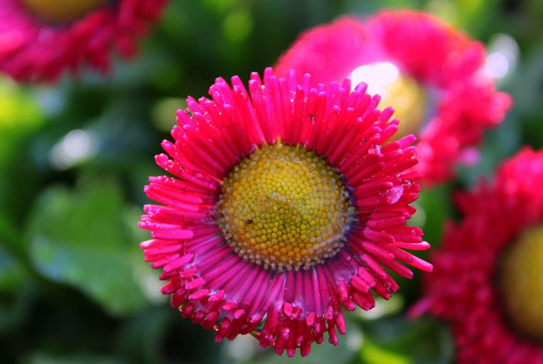 Keywords: geese flower daisy pomponette red red gänseblume colorful plant blossom bloom flower nature color bright with rainwater filled raindrop