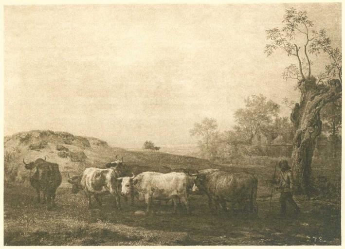 Keywords: Gemäldegalerie Alte Meister (Dresden) Galeriewerk Lücke 069.jpg Artwork Creator Paulus Potter Ein Rinderhirt mit seiner Herde Reproduktion in Heliogravüre vermisst Gal -Nr 1629 missing gallery-nr 1629 Institution Gemäldegalerie Alte Meister Dresden Beschreibung aus Karl Woermanns Galeriekatalog 1887 Ein Rinderhirt mit seiner Heerde Der Hirt schreitet nach links gewandt rechts vorn vor einem alten Weidenbaume hinter seinen sechs Rindern her In der Mitte des Mittelgrundes auf einer kleinen Anhöhe ein Wagen Im Hintergrunde ein Kirchturm Rechts im Mittelgrunde ein Bauernhof unter Bäumen Bezeichnet links unten 350px center <small>Eichenholz; h 0 36; br 0 49½ m</small> Die Königliche Gemäldegalerie zu Dresden Text von Hermann Lücke; Teil II Niederländische Deutsche Französische und Spanische Schulen München Franz Hanfstaengl ohne Jahr ca 1897 ; self scanned from own book PD-old-100 Other versions <gallery>File Gemäldegalerie Alte Meister Dresden Galeriewerk Braun 1529 jpg</gallery> Gemäldegalerie Alte Meister Dresden Galeriewerk Lücke Paintings formerly in the Gemäldegalerie Alte Meister Dresden Paintings by Paulus Potter |