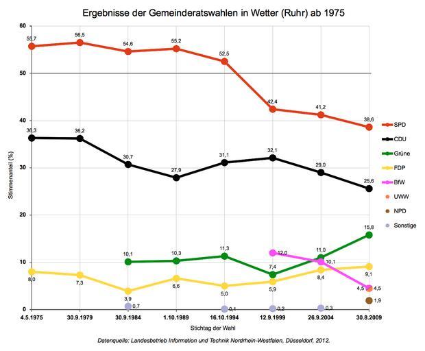 Keywords: Gemeinderatswahlen Wetter (Ruhr) Ergebnisse ab 1975.png de Kommunalwahlen in Wetter Ruhr Ergebnisse der Wahlen zum Gemeinderat ab 1975 “ Stimmenanteile in Prozent der abgegebenen gültigen Stimmen <br/>Bei der Wahl 2009 erreichten die beiden lokalen Wählergemeinschaften BfW und UWW jeweils 4 5 Prozent der Stimmen der entsprechende Punkt ist deshalb zweigeteilt dargestellt own <br/>Data source/Datenquelle Landesbetrieb Information und Technik NRW Düsseldorf 2012 Holger1959 2012-11-13 Files by Holger1959 Statistics of Wetter Ruhr Elections in North Rhine-Westphalia |