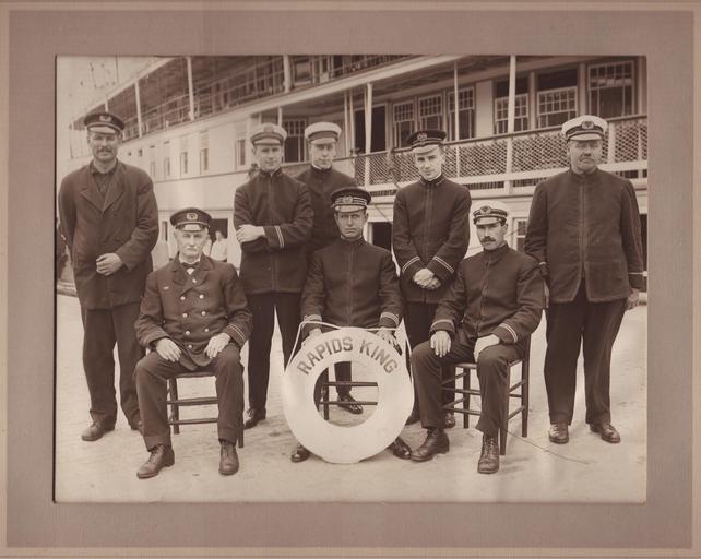 | Keywords: montreal 1920s shipping people sailors monochrome Crew members of the Rapids King, a steamship operated by the Richelieu and Ontario Navigation Company (Canada Steamship Lines after 1913). The middle decks of the ship are visible in the background. The photograph was taken by the photographic firm of Black and Bennett, 85 Bleury Street, Montreal. The Rapids King was built in Toronto in 1907 and was retired from service in 1931. An article in the New York Times of 18 July 1921 describes the crew's rescue of passengers of this ship on the previous day, after its rudder chain was broken in the Long Sault Rapids en route from Prescott, Ontario, to Montreal, Quebec. It is possible that this picture was taken after this event. Crew members of the Rapids King, a steamship operated by the Richelieu and Ontario Navigation Company (Canada Steamship Lines after 1913). The middle decks of the ship are visible in the background. The photograph was taken by the photographic firm of Black and Bennett, 85 Bleury Street, Montreal. The Rapids King was built in Toronto in 1907 and was retired from service in 1931. An article in the New York Times of 18 July 1921 describes the crew's rescue of passengers of this ship on the previous day, after its rudder chain was broken in the Long Sault Rapids en route from Prescott, Ontario, to Montreal, Quebec. It is possible that this picture was taken after this event. |