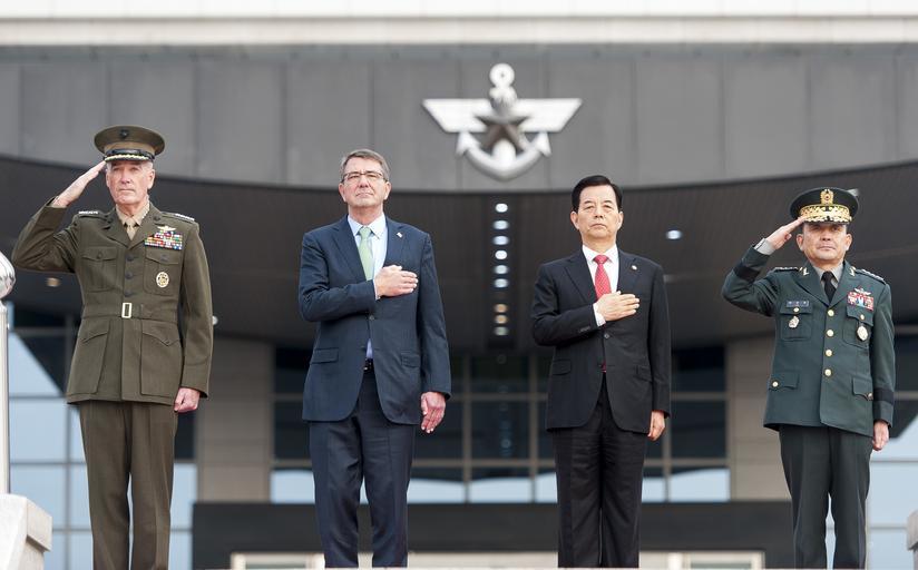 | Keywords: Gen. Dunford meets with Korean leaders 151102-D-PB383-0084.jpg en U S Marine Corps Gen Joseph F Dunford Jr chairman of the Joint Chiefs of Staff delivers a hand salute alongside U S Secretary of Defense Ash Carter Republic of Korea Minister of Defense Minkoo Han and Republic of Korea chairman of the Joint Chiefs of Staff Army Gen Lee Soon-Jin during an honor guard ceremony at the Joint Chiefs of Staff headquarters in Daejeon Republic of Korea Nov 2 2015 DoD photo by Navy Petty Officer 2nd Class Dominique A Pineiro 2015-11-02 Petty Officer 2nd Class Dominique Pineiro https //www dvidshub net/image/2261209 151102-D-PB383-0084 2015-11-02 04 33 27 KR 4 PD-USGov Joseph F Dunford Jr Ashton Carter Images from DoD uploaded by Fæ |