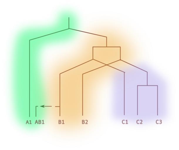 Keywords: Gene-homology.svg Die idealisierte Entwicklung eines Gens aus einer Urpopulation A in zwei neue Populationen B C Eine schräglinige Verzweigung stellt ein Artbildungsereignis eine horizontale Linie eine Genverdopplung dar Zwischen B und A findet außerdem horizontaler Gentransfer statt 2011-12-27 own Ayacop cc-zero Uploaded with UploadWizard Evolutionary biology |