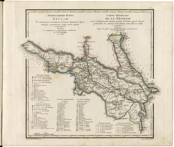 Keywords: General Map of Georgia. Showing Postal and Major Roads, Stations and the Distance in Versts Between Them- According to the Latest Verified Data in St. Petersburg in 1823 WDL2437.png Artwork ru Пядишев Василий Пет ович fr Piadyshev Vasiliĭ Petrovich en Piadyshev Vasiliĭ Petrovich zh 帕迪谢乌 瓦西利·佩特罗维奇 pt Piadyshev Vasiliĭ Petrovich ar بياديشيف فاسيليي بيتروفيتش es Piadyshev Vasiliĭ Petrovic ru Общая ка та Г узии Изоб ажение почтовой и основных до ог станций и асстояний между ними в ве стах Согласно последним п ове енным сведениям в Санкт- Пете бу ге в 1823 г fr Carte générale de la Géorgie Routes postales et principales gares et distances en verstes entre elles Selon les dernières données analysées à Saint- en General Map of Georgia Showing Postal and Major Roads Stations and the Distance in Versts Between Them According to the Latest Verified Data in St Petersburg in 1823 zh 格鲁吉亚普 图 显示邮政和主要道路,车站和车站之间的俄里 离 根据1823年 彼得堡 新确认数据 pt Mapa Geral da Geórgia Mostrando as rotas postais e os principais eixos rodoviários estações e a distância em versts entre eles Conforme os mais recentes dados verificados em São Petersburgo em 1823 ar خريطة عامة لجورجيا تظهر الطرق البريدية والرئيسية، والمحطات والمسافة في الفرست بينهم بطرسبورغ في 1823 ru Данная ка та 1823 года на кото ой изоб ажена те ито ия Г узии входит в <i> Геог афический атлас Российской импе ии Ца ства Польского и Великого княжества Финляндского </i> в кото ом соб ана 61 ка та Российской импе ии Атлас был составлен и отпечатан полковником В П Пядышевым; он является свидетельством того насколько тщательно и под обно составлялись ка ты усскими военными ка тог афами пе вой четве ти XIX века а ка те показаны к упнейшие го ода семь типов в зависимости от азме ов го ода к епости цитадели и фо ты монасты и и пустыни заводы и фаб ики почтовые дво ы и станции до оги т и типа и г аницы госуда ственные и г аницы п овинций Расстояния указаны в ве стах ве ста являлась усской единицей изме ения длины авной 1 0668 км кото ая к настоящему в емени вышла из упот ебления Условные обозначения и геог афические названия п иведены на усском и ф анцузском языках Изоб аженная те ито ия  в общих че тах соответствует те ито ии сов еменной Г узии fr Cette carte de 1823 de la Géorgie est issue de travaux plus importants <i>L'Atlas géographique de l'Empire russe du Royaume de Pologne et du Grand-Duché de Finlande</i> Geograficheskii atlas Rossiiskoi imperii tsarstva Pol'skogo i Velikogo kniazhestva Finliandskogo contenant 61 cartes de l'Empire russe Compilée et gravée par le colonel V P Piadyshev elle reflète la cartographie détaillée effectuée par les cartographes militaires russes au cours du premier quart du 19ème siècle La carte montre les centres de population sept gradations par taille les forteresses les redoutes et les forts les monastères et les déserts les plantes et les usines les relais et stations de poste les routes trois types et les frontières des États et des provinces Les distances sont indiquées en verstes une unité de mesure russe qui n'est plus utilisée égale à 1 0668 kilomètre Les légendes et les noms de lieux sont en russe et en français Le territoire représenté sur la carte correspond approximativement à celui de l'actuelle Géorgie en This 1823 map of Georgia is from a larger work <i>Geographical Atlas of the Russian Empire the Kingdom of Poland and the Grand Duchy of Finland</i> Geograficheskii atlas Rossiiskoi imperii tsarstva Pol'skogo i velikogo kniazhestva Finliandskogo containing 61 maps of the Russian Empire Compiled and engraved by Colonel V P Piadyshev it reflects the detailed mapping carried out by Russian military cartographers in the first quarter of the 19th century The map shows population centers seven gradations by size fortresses redoubts and forts monasteries and deserts plants and factories postal courtyards and stations roads three types and borders state and provincial Distances are shown in versts a Russian measure now no longer used equal to 1 0668 kilometers Legends and place names are in Russian and French The territory depicted on the map roughly corresponds to that of present-day Georgia zh 这幅 1823 年的格鲁吉亚 图出自 部巨 <i> 俄罗斯 国 波兰王国和芬兰大公国 理 图集 </i> (Geograficheskii atlas Rossiiskoi imperii tsarstva Pol'skogo i velikogo kniazhestva Finliandskogo),该 图集共包括 61 幅俄罗斯 国 图 这幅 图集由 V·P·Piadyshev 上校编制和刻版, 反映了 19 世纪前 25 年间俄罗斯军事制图师 达到的碎部测图水平 该 图标注了人口中心(根据大小分成七个等级) 要塞 小型防御工事与堡垒 修道院与沙漠 工厂 邮 和车站 道路(三种)以及 和 区的边界 离采用的单位是俄里,该单位目前已不再使用,1 俄里等于 1 0668 公里 图例和 名采用俄语和法语标注 该 图 描