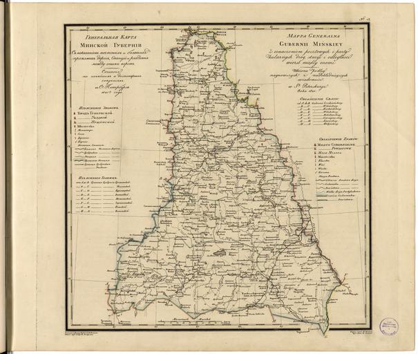 Keywords: General Map of Minsk Province. Showing Postal and Major Roads, Stations and the Distance in Versts Between Them- According to the Latest Data in St. Petersburg in 1821 WDL2587.png Artwork ru Пядишев Василий Пет ович fr Piadyshev Vasiliĭ Petrovich en Piadyshev Vasiliĭ Petrovich zh 帕迪谢乌 瓦西利·佩特罗维奇 pt Piadyshev Vasiliĭ Petrovich ar بياديشيف فاسيليي بيتروفيتش es Piadyshev Vasiliĭ Petrovic ru Общая ка та инской губе нии Изоб ажение почтовых и основных до ог станций и асстояний между ними в ве стах Согласно последним данным в Санкт - Пете бу ге в 1821 г fr Carte générale de la province de Minsk Routes postales et principales gares et distances en verstes entre elles Selon les données les plus récentes à Saint- Pétersbourg en 1821 en General Map of Minsk Province Showing Postal and Major Roads Stations and the Distance in Versts Between Them According to the Latest Data in St Petersburg in 1821 zh 明斯克 般 图, 显示邮政和主要道路,车站和车站之间的俄里 离 根据 pt Mapa Geral da Província de Minsk Mostrando rotas postais e principais eixos rodoviários estações e a distância em versts entre eles Segundo os dados mais recentes em São Petersburgo em 1821 ar خريطة عامة لمقاطعة مينسك تظهر الطرق البريدية والرئيسية، والمحطات والمسافة في الفرست بينهم ووفقا لآخر اليانات في سانت بطرسبورغ في 1821 ru Эта ка та 1821 года инской п овинции входит в объемный т уд <i> Геог афический атлас Российской импе ии ца ства Польского и великого княжества Финляндского </i>в кото ом соб аны 61 ка та Российской импе ии Атлас был составлен и отпечатан полковником В П Пядышевым; он является свидетельством того насколько тщательно и под обно составлялись ка ты усскими военными ка тог афами пе вой четве ти XIX века а ка те показаны к упнейшие го ода шесть типов в зависимости от азме а монасты и гостиницы почтовые станции до оги четы е типа и г аницы госуда ственные и г аницы п овинций Расстояния указаны в ве стах ве ста являлась усской единицей изме ения длины авной 1 0668 км кото ая к настоящему в емени вышла из упот ебления Условные обозначения и геог афические названия п иведены на усском и польском языках Те ито ия изоб аженная на ка те соответствует те ито ии сов еменной Бела уси fr Cette carte de 1821 de la province de Minsk est extraite d'un ouvrage plus important <i>Atlas géographique de l'Empire russe du Royaume de Pologne et du Grand-Duché de Finlande </i> Geograficheskii atlas Rossiiskoi imperii tsarstva Pol'skogo i Velikogo kniazhestva Finliandskogo contenant 61 cartes de l'Empire russe Compilé et gravé par le colonel V P Piadyshev il reflète la cartographie détaillée effectuée par les cartographes militaires russes durant le premier quart du 19ème siècle La carte indique les centres urbains six gradations selon la taille les monastères auberges relais de postes routes quatre types et les frontières provinces districts Les distances sont indiquées en verstes une unité de mesure russe qui n'est maintenant plus utilisée égale à 1 0668 kilomètre Les légendes et noms des lieux sont en russe et en polonais Le territoire représenté sur la carte correspond à l'actuelle Biélorussie en This 1821 map of Minsk Province is from a larger work <i>Geographical Atlas of the Russian Empire the Kingdom of Poland and the Grand Duchy of Finland </i> Geograficheskii atlas Rossiiskoi imperii tsarstva Pol'skogo i velikogo kniazhestva Finliandskogo containing 61 maps of the Russian Empire Compiled and engraved by Colonel V P Piadyshev it reflects the detailed mapping carried out by Russian military cartographers in the first quarter of the 19th century The map shows population centers six gradations by size monasteries inns postal stations roads four types and borders provincial district Distances are shown in versts a Russian measure now no longer used equal to 1 0668 kilometers Legends and place names are in Russian and Polish The territory depicted on the map is in present-day Belarus zh 这幅 1821 出版的年的明斯克 图出自较大型的 图集 <i> 俄罗斯 国 波兰王国和芬兰大公国 理 图集 </i>(Geograficheskii atlas Rossiiskoi imperii tsarstva Pol'skogo i velikogo kniazhestva Finliandskogo),该 图集共包括 61 幅俄罗斯 国 图 这幅 图集由 V·P·Piadyshev 上校编制和刻版, 反映了19 世纪前 25 年间俄罗斯军事制图师 达到的详细制图水平 该 图标注了人口中心(根据大小分成六个等级) 修道院 旅馆 邮 道路(四种)以及 和 区的边界 离采用的单位是俄里,该单位目前已不再使用,1 俄里等于 1 0668 公里 图例和 名采用俄语和波兰语标注 该 图 绘领 是当今的白俄罗斯 pt Este mapa da Província Minsk de 1821 provém de uma obra maior <i>Atlas geográfico do Império Russo do Reino da Polônia e do Grão-Ducado da Finlândia </i> Geograficheskii atlas Rossiiskoi imperii tsarstva Pol'skogo i velikogo kniazhestva Finliandskogo contendo 61 mapas do Império Russo Compilad