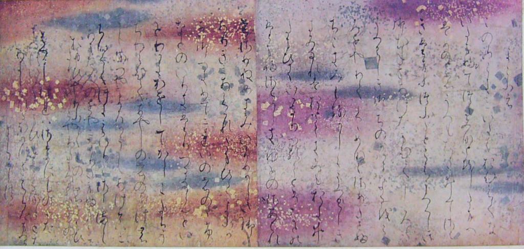 | Keywords: Genji emaki YOKOBUE Ms.JPG en A Calligraphy of the Chapter YOKOBUE Flute of Illustrated handscroll of Tale of Genji written by MURASAKI SHIKIBU 11th cent Ink on Ornamented Paper Colour Gold Foil etc The handscroll was made in about ACE1130 and stored in TOKUGAWA Museum Japan The handscroll were separated to each sections and mounted to frame for conservation GENJI-MONOGATARI-EMAKI published by TOKUGAWA MUSEUM NAGOYA Japan 1937 Author Twelfth century Illustrated Handscroll of The Tale of Genji Tokugawa Art Museum Japanese calligraphy in the Heian period PD-old |