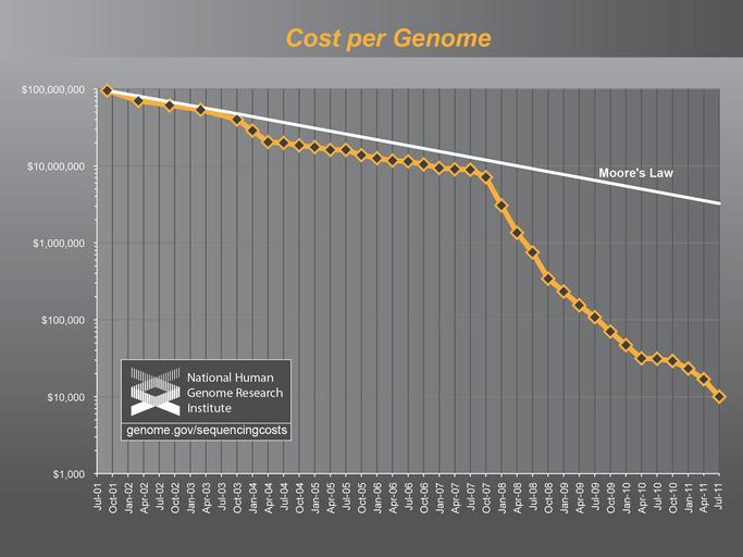 Keywords: Genome sequencing costs 2011.jpg en From http //www genome gov/sequencingcosts DNA Sequencing Costs Data from the NHGRI Large-Scale Genome Sequencing Program Accessed 11 December 2011 This is the general cost across the industry for producing the sequence data for a human-sized genome Considerations have been made for the different amounts of sequencing coverage required for different sequencing technologies Specifically 6x for Sanger sequencing 10x for 454 30x for Illumina and SOLiD Details of what was counted as sequence production costs Labor administration management utilities reagents and consumables Sequencing instruments and other large equipment amortized over three years Informatics activities directly related to sequence production e g laboratory information management systems and initial data processing Shotgun library construction required for preparing DNA to be sequenced Submission of data to a public database http //oamp od nih gov/dfas/faqIndirectCosts asp difference Indirect Costs as they relate to the above items See http //www genome gov/sequencingcosts genome gov/sequencingcosts for full assumptions used PD-USGov-NIH 2011-12-13 NHGRI http //www genome gov/sequencingcosts www genome gov/sequencingcosts Wetterstrand KA PD-USGov Uploaded with UploadWizard DNA sequencing Genetics National Institutes of Health Genome gov images Genomics |