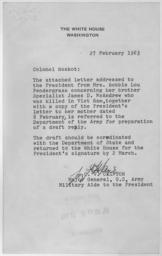 Keywords: Genral Clifton to Colonel Hoskot Re, James D. McAndrew February 27, 1963 - NARA - 194133.tif Scope and content Note from General Chester V Clifton to Colonel Hoskot concerning letter from Mrs Bobbie Lou Pendergrass on the death of her brother Armry Specialist James D McAndrew General notes 194133 Local identifier President 1961-1963 Kennedy Office of the President 01/20/1961 - 11/22/1963 John F Kennedy Library NLJFK Columbia Point Boston MA 02125-3398 1963-02-27 Record group Collection JFK-WHCF Papers of President Kennedy White House Central Files 01/20/1961 - 11/22/1963 Record group ARC 1176 Papers of President Kennedy White House Central Files White House Subject File compiled 01/20/1961 - 11/22/1963 Series ARC 194123 File unit Papers of President Kennedy White House Central Files White House Subject File National Security - Defense 01/20/1961 - 11/22/1963 File unit ARC 194127 Variant control numbers NAIL Control Number NLK-WHCF-SBJCTFL-ND922M-NOTEREMCANDREW yes Other versions NARA-cooperation PD-USGov Documents in English |
