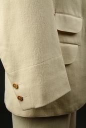 Keywords: Gentlemannen - om män och mode - Hallwylska museet - 85873.tif KOSTYM kavaj- <br/><br/>Bestående av kavaj väst och byxor <br/><br/>Av vit cheviot samt med gulvita benknappar Hand- och maskinsydda <br/><br/>Kavaj Enradig livskuren med fyra knappar samt nedviken krage och korta slag i det vänstra ett knapphål; framstyckenas hörn rundade Ryggen med sid- och axelsömmar Knapparna runda fyrhåliga med plan framsida och stavformig kant Foder av smalrandigt vitt siden alpacka på högra framstycket en bröstficka; ärmfoder av smalrandigt crèmegult halvsiden <br/><br/>Mått Ärmhålsdjup 23 cm ; längd hel 76 cm ; ryggbredd halv 19 cm ; ärmlängd 80 cm ; bröstvidd fram 44 cm ; bröstvidd hel 106 cm ; livvidd 98 cm <br/><br/>Väst Enradig med sex knappar som de mindre i kavajen korta vinkelskurna slag samt två svagt snedskurna sidofickor samt på vänstra framstycket dessutom en dylik bröstficka alla med rak kantslå Ryggstycke av vit ylleklot ett stycke från nedre kanten två spänntampar med spänne av svartlackerad mässing och med två taggar tornar Nedtill i mitten ett sprund Fodret i rygg- och framstycken av blommig vit bomullssatin <br/><br/>Mått Schalöppning 31 cm Hel västlängd 70 cm <br/><br/>Byxor Upptill på vardera framstycket en snedskuren tvärficka Midjeband med hake och hyska knapp och knapphål samt sex hängselknappar Gylfen med fyra små knappar ock knapphål Midjebandet fodrat med rött skinn saffian bak- och gylffoder av vitt bomullstyg Fickor av vitt bomullstyg Knapphålen handsydda med vitt grovt silke eller vit bomullstråd <br/><br/>Mått Yttersöm längd 106 cm ; innersöm längd 82 cm ; livvidd 82 cm ; stussvidd 108 cm ; lårvidd 66 cm ; knävidd 48 cm ; vidd nedtill 46 cm <br/><br/>Förfärdigade efter beställning av Walther von Hallwyl i Oktober 1900 hos skrädderifirman Fr Kaedings Efterträdare Zittorin Lundvik hovleverantörer <br/><br/>Begagnad av Walther von Hallwyl under hans resa genom Egypten och Sudan tillsammans med sin maka dotter och svärson samt fröken Ida Uhse den 5 November 1900 till 29 Mars 1901 original caption Gentlemannen - om män och mode<br/> Nyckelord Ärm Kavaj Vit Colonialt Herrmode Knappar Föremålsbild HWY Walther von Hallwyl place of origin Stockholm SE original filename hm_dig1924 8246 inventory number HWY XXI I A 03 85873 CC-BY-SA Samuel Uhrdin <gallery caption Different images of same object > File Gentlemannen - om män och mode - Hallwylska museet - 85871 tif File Kavajkostym bestående av kavaj väst och byxor Tillhört Walther von Hallwyl - Hallwylska museet - 89103 tif File Gentlemannen - om män och mode - Hallwylska museet - 85872 tif File Detalj av kostym Foto till boken Ett sekel av dräkt och mode ur de Hallwylska samlingarna - Hallwylska museet - 89347 tif File Kostym detalj Foto till boken Ett sekel av dräkt och mode ur de Hallwylska samlingarna - Hallwylska museet - 89386 tif </gallery> Samuel Uhrdin White clothing 1900s fashion Male clothing Clothing in the Hallwyl museum Trousers Media contributed by LSH unmatched objKeyword Media contributed by LSH unmatched creator Media contributed by LSH unmatched keyword Media contributed by LSH 2013-10 |