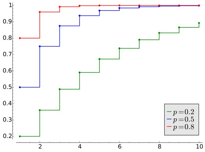 | Keywords: Geometric distribution CDF.svg en Plot of geometric distribution CDF for values of p in 0 2; 0 5; 0 8 Source code Sagemath that generated the image is available at http //pastebin com/U2YEtstY fr Courbe de la fonction de répartition de la loi géométrique pour des valeurs de p dans 0 2; 0 5; 0 8 Le code source en Sage utilisé pour générer l'image est disponible à l'adresse suivante http //pastebin com/U2YEtstY 2016-01-26 own Architektormaran other versions cc-zero Probability distributions |