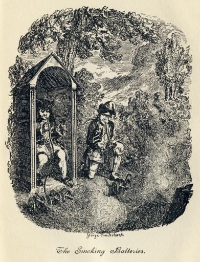 Keywords: George Cruikshank - Tristram Shandy, Plate VIII. The Smoking Batteries.png From George Cruikshank's illustrations to Laurence Sterne's Tristram Shandy Plate VIII The Smoking Batteries Uncle Toby is in the sentry box the corporal on the right Basically the corporal has invented a way to make multiple cannons be fired at once by using the principles of a hookah - when a puff is taken the cannons fire Unfortunately the two find the puffing a little too enjoyable The Life and Opinions of Tristram Shandy Gentleman and A Sentimental Journey Through France and Italy by Laurence Sterne With Illustrations by George Cruikshank London Hutchinson Co Paternoster Row 1906 This version published 1906 George Cruikshank 1792 “1878 PD-Old-100 Part of a series of illustrations of Tristram Shandy <gallery widths 200px heights 250px> File George Cruikshank - Tristram Shandy Plate I The Effects of Trim's Eloquence jpg Plate I The Effects of Trim's Eloquence<br/> PNG Scan File George Cruikshank - Tristram Shandy Plate II Obadiah leading in Dr Slop jpg Plate II Obadiah leading in Dr Slop<br/> PNG Scan File George Cruikshank - Tristram Shandy Plate III The Jack-boots transformed into Mortars jpg Plate III The Jack-boots transformed into Mortars<br/> PNG Scan File George Cruikshank - Tristram Shandy Plate IV The long-nosed Stranger of Strasburg jpg Plate IV The long-nosed Stranger of Strasburg<br/> PNG Scan File George Cruikshank - Tristram Shandy Plate V My Uncle Toby on his Hobby-horse jpg Plate V My Uncle Toby on his Hobby-horse<br /> PNG Scan File George Cruikshank - Tristram Shandy Plate VI Trim's relation of Tristram's misfortune jpg Plate VI Trim's relation of Tristram's misfortune<br/> PNG Scan File George Cruikshank - Tristram Shandy Plate VII The Quarrel of Slop and Susannah jpg Plate VII The Quarrel of Slop and Susannah<br/> PNG Scan File George Cruikshank - Tristram Shandy Plate VIII The Smoking Batteries jpg Plate VIII The Smoking Batteries<br/> PNG Scan </gallery> minor cleanup and levels adjustment George Cruikshank's illustrations of Tristram Shandy 1832 8 GCTS |