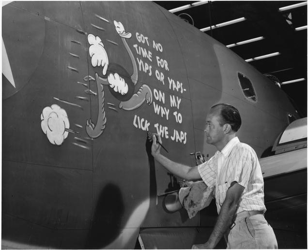 | Keywords: George ("Randy") McCraw, decorating a Vega Ventura bomber. Every ship that rolls off the line carries a cartoon aimed... - NARA - 196380.tif Scope and content General notes 196380 Local identifier Roosevelt Franklin D Franklin Delano 1882-1945 Franklin D Roosevelt Library NLFDR 4079 Albany Post Road Hyde Park NY 12538-1999 ca 05/1942 Record group Collection FDR-PHOCO Franklin D Roosevelt Library Public Domain Photographs 1882 - 1962 Record group ARC 1184 Franklin D Roosevelt Library Public Domain Photographs compiled 1882 - 1962 Series ARC 195301 File unit File unit ARC Variant control numbers NAIL Control Number NLR-PHOCO-A-66120 12 yes Other versions <gallery> File George_ Randy _McCraw _decorating_a_Vega_Ventura_bomber _Every_ship_that_rolls_off_the_line_carries_a_cartoon_aimed _-_NARA_-_196380 tif tif File George_ Randy _McCraw _decorating_a_Vega_Ventura_bomber _Every_ship_that_rolls_off_the_line_carries_a_cartoon_aimed _-_NARA_-_196380 jpg jpg </gallery> NARA-cooperation PD-USGov Nose art on Lockheed PV-1 Ventura Aircraft nose art PV-1 NARA TIF images with categorized JPGs |