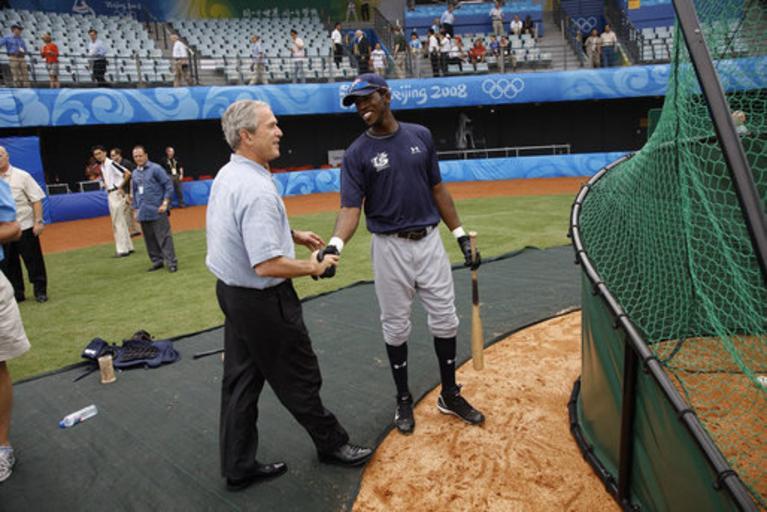 | Keywords: George W Bush with Dexter Fowler.jpg en President George W Bush meets with U S Olympic men's baseball team player Dexter Fowler of Alpharetta Ga while attending a practice game between the U S and the Chinese Olympic men's baseball teams Monday Aug 11 2008 at the 2008 Summer Olympic Games in Beijing http //www whitehouse gov/news/releases/2008/08/images/20080811_x0h3545-515h jpg White House Eric Draper 08/11/2008 PD-USGov George W Bush with sportspeople George W Bush in 2008 George W Bush shaking hands Baseball at the 2008 Summer Olympics Dexter Fowler Photographs by Eric Draper |