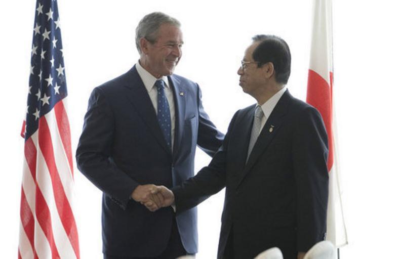 Keywords: George W Bush and Yasuo Fukuda 20080706.jpg en President George W Bush and Prime Minister Yasuo Fukuda shake hands after their meeting at the Windsor Hotel Toya Resort and Spa in Tōyako Town Abuta District Hokkaidō on July 6 2008 http //www whitehouse gov/news/releases/2008/07/images/20080706_d-0011-515h html President Bush Participates in Joint Press Availability with Prime Minister Fukuda of Japan White House photo by Eric Draper 2008-07-06 PD-USGov George W Bush in 2008 Yasuo Fukuda in 2008 George W Bush and Yasuo Fukuda 34th G8 summit Photographs by Eric Draper |