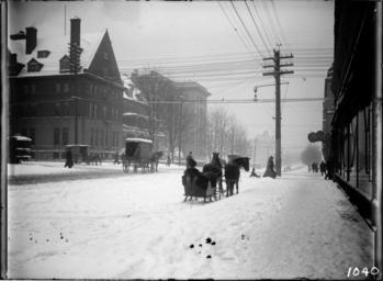 Keywords: blackandwhite monochrome black and white Georgia Street in the snow VPL Accession Number: 2452 Date: 190- Photographer/Studio: Timms, Philip Content: Looking west from the east side of Granville Street (in front of the Hudson's Bay Co.) with the first Hotel Vancouver left, Georgia Pharmacy right (at the Johnston-Howe Building), and Wesley Methodist Church partially visible in the distance (centre-right). Wagons, a streetcar, and horse-drawn sleigh. See also 66973 Topic: Department stores Street-railroads Hotels Drugstores Horse-drawn vehicles Church buildings Winter More information on our historical photograph collection: www.vpl.ca/historicalphotos Georgia Street in the snow VPL Accession Number: 2452 Date: 190- Photographer/Studio: Timms, Philip Content: Looking west from the east side of Granville Street (in front of the Hudson's Bay Co.) with the first Hotel Vancouver left, Georgia Pharmacy right (at the Johnston-Howe Building), and Wesley Methodist Church partially visible in the distance (centre-right). Wagons, a streetcar, and horse-drawn sleigh. See also 66973 Topic: Department stores Street-railroads Hotels Drugstores Horse-drawn vehicles Church buildings Winter More information on our historical photograph collection: www.vpl.ca/historicalphotos |