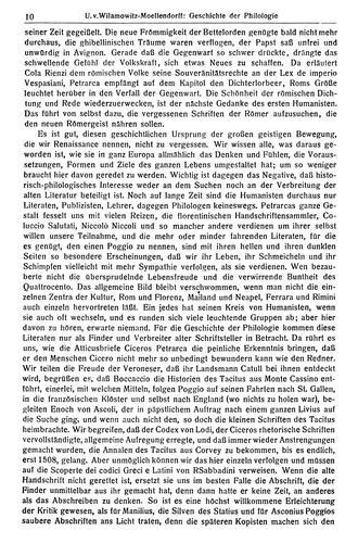 Keywords: Gercke-Norden 1,1 012.jpg 011 013 seiner Zeit gegeißelt Die neue Frömmigkeit der Bettelorden genügte bald nicht mehr<br/> durchaus die ghibellinischen Träume waren verflogen der Papst saß unfrei und<br/> unwürdig in Avignon Gerade daß die Gegenwart so schwer drückte drängte das<br/> schwellende Gefühl der Volkskraft sich etwas Neues zu schaffen Da erläutert<br/> Cola Rienzi dem römischen Volke seine Souveränitätsrechte an der Lex de imperio<br/> Vespasiani Petrarca empfängt auf dem Kapitol den Dichterlorbeer Roms Größe<br/> leuchtet herüber in den Verfall der Gegenwart Die Schönheit der römischen Dich-<br/> tung und Rede wiederzuerwecken ist der nächste Gedanke des ersten Humanisten <br/> Das führt von selbst dazu die vergessenene Schriften der Römer aufzusuchen die<br/> den neuen Römergeist nähren sollen <br/> Es ist gut diesen geschichtlichen Ursprung der großen geistigen Bewegung <br/> die wir Renaissance nennen nicht zu vergessen Wir wissen alle was daraus ge-<br/> worden ist wie sie in ganz Europa allmählich das Denken und Fühlen die Voraus-<br/> setzungen Formen und Ziele des ganzen Lebens umgestaltet hat; um so weniger<br/> braucht hier davon geredet zu werden Wichtig ist dagegen das Negative daß histo-<br/> risch-philologisches Interesse weder an dem Suchen noch an der Verbreitung der<br/> alten Literatur beteiligt ist Noch auf lange Yeit sind die Humanisten durchaus nur<br/> Literaten Publiyisten Lehrer dagegen Philologen keineswegs Petrarcas ganye Ge-<br/> stalt fesselt uns mit vielen Reizen die florentiniscen Handschiftensammler Co-<br/> luccio Salutati Niccolò Niccoli und so mancher andere verdienen um ihrer selbst<br/> willen unsere Teilnahme und die mehr oder minder fahrenden Literaten für die<br/> es genügt den einen Poggio zu nennen sind mit ihren hellen und ihren dunklen<br/> Seiten so besondere Erscheinungen daß wir ihr Leben ihr Schmeicheln und ihr<br/> Schimpfen vielleicht mit mehr Sympathie verflogen als sie verdienen Wen bezau-<br/> berte nicht die übersprudelnde Lebensfreude und die verwirrende Buntheit des<br/> Quattrocento Das allgemeine Bild bleibt verschwommen wenn man nicht die ein-<br/> zelnen Zentra der Kultur Rom und Florenz Mailand und Neapel Ferrara und Rimini<br/> auch einzeln hervortreten läßt Ein jedes hat seinen Kreis von Humanisten wenn<br/> sie auch oft wechseln und es runden sich viele leuchtende Gruppen ab; aber hier<br/> davon zu hören erwarte niemand Für die Geschichte der Philologie kommen diese<br/> Literaten nur als Finder und Verbreiter alter Schriftsteller in Betracht Da rührt es<br/> uns wie die Atticusbirefe Ciceros Petrarca die peinliche Erkenntnis bringen daß<br/> er den Menschne Cicero nicht mehr so unbedingt bewundern kann wie den Redner <br/> Wir teilen die Freude der Veroneser daß ihr Landsmann Catull bei ihnen entdeckt<br/> wird begrüßen es daß Boccaccio die Historien des Tacitus aus Monte Cassino ent-<br/> führt einerlei mit welchen Mitteln folgen Poggio auf seinen Fahrten nach St Gallen <br/> in die französischen Klöster und selbst nach England wo nichts zu holen war be-<br/> gleiten Enoch von Ascoli der in päpstlichem Auftrag nach einem ganzen Livius auf<br/> die Suche ging und wenn auch nicht den so doch die kleinen Schriften des Tacitus<br/> heimbrachte Wir begreifen daß der Codex von Lodi der Ciceros rhetorische Schriften<br/> vervollständigte allgemeine Aufregugn erregte und daß immer wieder Anstrengungen<br/> gemacht wurden die Annalen des Tacitus aus Corvey zu bekommen bis es endlich <br/> erst 1508 gelang Aber unmöglich können wer das hier einzeln verfolgen und müssen<br/> auf die Scoperte dei codici Greci e Latini von RSabbadini verweisen Wenn die alte<br/> Handschrift nicht gerettet ist ersetzt sie uns im besten FAlle die Abschrift die der<br/> Finder unmittelbar aus ihr gemacht hat denn dann hatte er keine Zeit an anderes<br/> als das Abschreiben zu denken So ist es eine höchst willkommene Erleichterung<br/> der Kritik gewesen als für Manilius die Silven des Statius und für Asconius Poggios<br/> saubere Abschriften ans Licht traten denn die spüterne Kopisten machen sich den<br/> 1921 books |