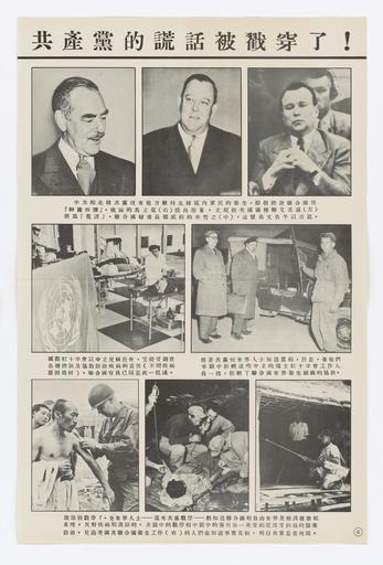 Keywords: Germ Warfare - NARA - 5729956.jpg text: 共產黨的謊話被戳穿了! 中共和北韓共黨沒 能力維持北韓 內軍民的衞生,却指控說聯合 用 細菌炸彈 俄 的馬立克(右)提出指責,立刻被美 務卿艾其 (左)指爲 荒謬 聯合 秘書長挪威籍的 哲之(中),也發表文吿予以否認 際紅十字 以中立見稱於世,它接受調査各種控訴及協助防治疾病的責任(不問疾病原因爲何) 聯合 官員已同意此 提議 但是共黨 世界人士知道 相,於是,像他 早 中拒絕 些中立的瑞士紅十字 工 人員 樣,拒絕了聯合 世界衞生組織的協助 謊話被戳穿了 全世界人士 還 共黨戰俘 都知道聯合 和自由世界是維譏健康和 理,反封疾病和謊話的 左 中的戰俘和中 中的傷兵第 次受到從沒受到過的醫藥 診治 見過美 及聯合 衞生工 (右)的人 也知道事實 相,明白共黨是 說謊 Scope and content Communists caught in the act of lying Korean War propaganda shows Yakov Malik top right Trygve Lie top center and Dean Acheson top left General notes 5729956 Local identifier 306-PPA-56 U S Information Agency 08/01/1953 - 03/27/1978 Most Recent <br/> Department of State Bureau of Public Affairs International Information and Educational Exchange Program 1949 - 1952 Predecessor Still Picture Records Section Special Media Archives Services Division NWCS-S National Archives at College Park 8601 Adelphi Road College Park MD 20740-6001 1952-05-08 Record group Record Group 306 Records of the U S Information Agency 1900 - 2003 Record group ARC 622 Propaganda Posters Distributed in Asia compiled ca 1950 - 1955 Series ARC 1767935 File unit File unit ARC Variant control numbers Agency-Assigned Identifier PO-112-C Other versions NARA-cooperation PD-USGov Political posters of the United States Propaganda Posters in Chinese Yakov Malik Trygve Lie Dean Acheson |