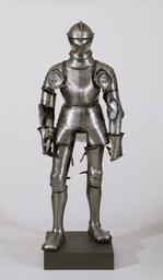 | Keywords: German - Armor for Fighting on Horseback - Walters 51581.jpg The heavily armored knight of noble birth wielding a 12 foot lance and mounted on a sturdy war-horse was the dominant force on the medieval battlefield from the 9th to the mid 14th century by which time improved weapons and training made the infantry soldiers on foot his equal However mounted armored nobles continued to find an outlet for their energy in jousting tournaments This armor is characteristic of that worn in mid 16th-century Germany but not all the parts are by the same maker The black painted trim and the rope-like edging seen for example around the couters elbow protectors and along the top of the breastplate are typical The lance rest below the right shoulder The closed helmet provides full-face protection and has a movable visor that could be lifted as a demonstration of good will or when there was no danger Many of the names for parts of the armor come from French words for the body parts that they protect such as cuisse thigh gorget throat or gauntlet hand A full suit of armor might weigh 45 to 50 pounds The closed helmet currently displayed with this suit of armor is Walters 51 578 1 ca 1530 1560 Renaissance steel paint leather modern felt; wood steel cm 167 6 accession number 51 581 30640 Henry Walters Baltimore 1921 mode of acquisition unknown Walters Art Museum Henry Walters Acquired by Henry Walters 1921 place of origin Germany Walters Art Museum license Renaissance applied arts in the Walters Art Museum Armour in the Walters Art Museum Armour of Germany Renaissance armour German art in the Walters Art Museum 16th-century armour Lance rest |