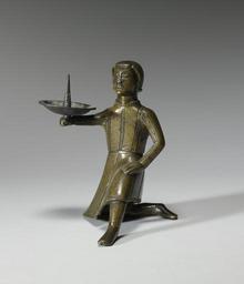 Keywords: German - Candlestick with a Young Page - Walters 5484 - Three Quarter.jpg Candles were expensive and used by affluent households This candle holder demonstrates the desire to make home furnishings ornamental imaginative and indicative of status It is cast in the shape of a young page who kneels to hold the candle for his lord -- understood to be the person to whom this candle stick belonged century 14 15 Medieval bronze cm 14 6 10 8 11 7 accession number 54 84 20860 Lehmann secretary to Baron Alphonse de Rothschild Paris Henri Daguerre Paris date and mode of acquisition unknown Henry Walters city Baltimore Walters Art Museum Henry Walters Acquired by Henry Walters 1927 Highlights from the Collection The Walters Art Gallery Baltimore 1998-2001 place of origin Germany Walters Art Museum license Medieval metalwork in the Walters Art Museum German art in the Walters Art Museum Media contributed by the Walters Art Museum needs category review |