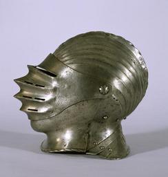 Keywords: German - Close Helmet of the "Maximilian" Style - Walters 51465 - Profile.jpg A close helmet encloses the head as opposed to a sallet This type combines the rounded Italian shape with the crisp vertical fluting crest and corded borders that evolved from German late-medieval armor The fluting deflected projectiles and made the plate stronger without adding weight At 5 lb 11 7 oz this piece is not heavy for a close helmet The style is associated with Emperor Maximilian I reigned 1493-1519 Archduke Albert's famous ancestor who was keenly interested in improving armor technology between 1520 1525 steel cm 31 6 23 2 33 accession number 51 465 2304 Sale American Art Association New York November 19 1921 no 307 Henry Walters Baltimore 1921 mode of acquisition unknown Walters Art Museum Henry Walters Acquired by Henry Walters 1921 place of origin Nuremberg Germany Walters Art Museum license Armour in the Walters Art Museum Armour of Germany Baroque art in the Walters Art Museum German art in the Walters Art Museum Close helmets |