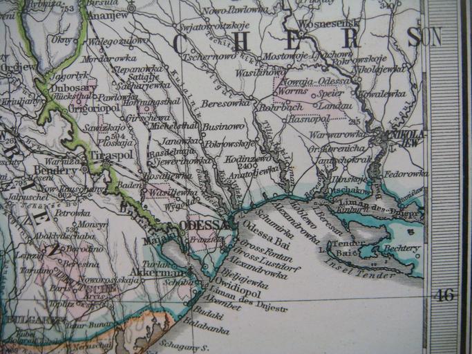 | Keywords: German map of Southern Russia end XIX century.JPG en Abstract from German map of European Russia of late XIX century Odessa city and vicinity Settlements of German immigrants in Russian Empire highlighted by pink color ru Ф агмент ка ты конца XIX века из ге манского геог афического атласа Район Одессы и Бесса абии а ка те озовым цветом выделены земли немцев-колонистов own HOBOPOCC 2010-05-18 Old maps of Odessa Maps of the history of Odessa Oblast PD-old | ||||