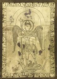 | Keywords: German - The Mondsee Gospels and Treasure Binding with the Evangelists and Crucifixion - Walters W8 - Detail A.jpg Because of its organic nature and tactile qualities ivory was sometimes associated with flesh The luxurious binding of a gospel book probably originally made in the eleventh or twelfth century but heavily restored in the nineteenth century contains ivory plaques depicting the Four Evangelists the figure of Matthew is a nineteenth-century replacement The ivory plaques are placed between the arms of a silver filigree cross whose flourishing pattern suggests teeming life a reference to the everlasting life offered to humanity through Christ's Crucifixion That event is depicted in gold leaf at the center of the cross protected by a large rock crystal In this example the materials help the viewer to interpret the conceptual structure of the work Whereas the figures of the Evangelists the human transmitters of the gospels are tangible and tactile the image of the crucified Christ has a floating ghostly quality mediated and refracted by the curved surface of the crystal Rock crystal was understood as frozen water and because of its transparency was associated with purity hence with Christ its dual nature as liquid and solid is invoked here to suggest Christ's status as hovering between the world of the flesh ad that of the spirit 11th or 12th century with later additions and alterations parchment bound between oak boards covered with leather silk damask silver filigree gilded panels four ivory panels one modern depicting the Evangelists and incised gold leaf depicting the Crucifixion under convex rock crystal cm 29 6 23 10 4 accession number W 8 17493 Jacques Rosenthal art dealer Munich early 20th century mode of acquisition unknown Henry Walters Baltimore between 1925-1931 by purchase Walters Art Museum Henry Walters Acquired by Henry Walters 4000 Years of Modern Art The Walters Art Gallery Baltimore; Baltimore Museum of Art Baltimore 1953-1957 The History of Bookbinding 525-1950 A D Baltimore Museum of Art Baltimore 1957-1958 2 000 Years of Calligraphy The Walters Art Gallery Baltimore 1965 Liturgical Objects in The Walters Art Gallery The Walters Art Gallery Baltimore 1967 Splendor in Books The Walters Art Gallery Baltimore; Grolier Club New York 1977-1978 Ivory The Sumptuous Art The Walters Art Gallery Baltimore 1983-1984 Illuminated Manuscripts Masterpieces in Miniature The Walters Art Gallery Baltimore 1984-1985 Regensburger Buchmalerei Von frühkarolingischer Zeit bis zum Ausgang des Mittelalters Museen der Stadt Regensburg Regensburg 1987 Judging a Book by its Cover Fine Bindings The Walters Art Gallery Baltimore 1988 Covered in Meaning Book Bindings from The Walters The Walters Art Gallery Baltimore 1997-1998 Illuminating the Word Gospel Books in the Middle Ages The Walters Art Museum Baltimore 2004 Schatzkammer Henry Walters' German Manuscripts The Walters Art Museum Baltimore 2006 In the Beginning Bibles Before the Year 1000 Freer Gallery of Art Washington 2006-2007 Treasures of Heaven The Cleveland Museum of Art Cleveland; The Walters Art Museum Baltimore; The British Museum London 2010-2011 place of origin Regensburg Germany Walters Art Museum license 2D Medieval metalwork in the Walters Art Museum Media contributed by the Walters Art Museum needs artist review Saint Michael and the dragon Walters MS W8 - Mondsee Gospel Lectionary Filigree |