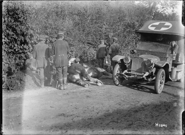 | Keywords: blackandwhite monochrome outdoor black and white German prisoners burying a dead horse behind New Zealand lines in France. At right is an ambulance. Photograph taken 1918 by Henry Armytage Sanders. Inscriptions: Inscribed - Photographer's title on negative -bottom right: H1241. Quantity: 1 b&w original negative(s). Physical Description: Dry plate glass negative 4.75 x 6.5 inches German prisoners burying a horse, France. Royal New Zealand Returned and Services' Association :New Zealand official negatives, World War 1914-1918. Ref: 1/2-013788-G. Alexander Turnbull Library, Wellington, New Zealand. natlib.govt.nz/records/23120948 German prisoners burying a dead horse behind New Zealand lines in France. At right is an ambulance. Photograph taken 1918 by Henry Armytage Sanders. Inscriptions: Inscribed - Photographer's title on negative -bottom right: H1241. Quantity: 1 b&w original negative(s). Physical Description: Dry plate glass negative 4.75 x 6.5 inches German prisoners burying a horse, France. Royal New Zealand Returned and Services' Association :New Zealand official negatives, World War 1914-1918. Ref: 1/2-013788-G. Alexander Turnbull Library, Wellington, New Zealand. natlib.govt.nz/records/23120948 |