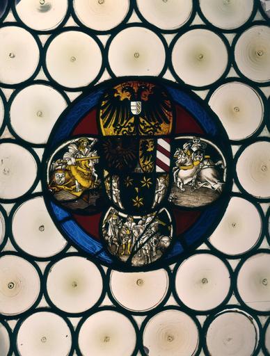 | Keywords: German - Stained Glass Roundel with Jousting Scenes - Walters 4676.jpg Walters Art Museum artwork Anonymous German <br/> After Round or rectangular panels of stained glass added decoration as well as changing colored light patterns to a room They were set into larger windows made up of small segments of clear glass in either a diamond or round bull's-eye or bottle pattern held together with strips of metal Within the quatrefoil four-lobe design are jousting knights who bear the coats of arms of the Geuder and Rieter von Kronburg families with their heralds gathered below The centrally featured coats of arms are the Habsburg double-headed eagle with the combined arms of the houses of Austria and Burgundy on its breast the Nuremberg virgin eagle municipal emblem with to the right the arms of Nuremberg as an imperial city and below the stars of the Geuder family 1508 Renaissance stained and clear glass vitreous paint pot metal bottle glass cm 64 49 accession number 46 76 30908 Gender von Heroltsberg family by commission H G Gutekunst Stuttgart 1877 mode of acquisition unknown Felix Leipzig 1911 mode of acquisition unknown Stillwell New York date and mode of acquisition unknown Arnold Seligmann Rey and Co date and mode of acquisition unknown Walters Art Museum 1951 by purchase Museum purchase 1951 3000 Years of Glass Treasures from The Walters Art Gallery The Walters Art Gallery Baltimore 1982 Gothic and Renaissance Art in Nuremberg 1300-1550 The Metropolitan Museum of Art New York; Germanisches Nationalmuseum Nuremberg 1986 place of origin Nuremberg Germany Walters Art Museum license Renaissance applied arts in the Walters Art Museum German art in the Walters Art Museum Coats of arms on stained glass windows in the United States Media contributed by the Walters Art Museum needs artist review Geuder von Heroldsberg family Hans von Kulmbach Jousting in art |