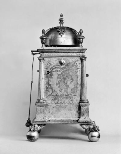 | Keywords: German - Table Clock - Walters 58245.jpg This clock indicates the hours 1-24 on the main dial and the quarter hours on the lower dial When the clock was made in 1573 minutes were not in common use as they were hard to measure ; time was usually divided into hours and quarter hours The sides of the case were intended to be removed On the exterior of the left panel is engraved the image of the Habsburg emperor Charles V Caesar Carolus ; the panel on the right has on the inside a sundial for setting the clock and a compass north had to be established to read the sundial On the exterior is engraved the figure of the Old Testament king David The original spring mechanism of the clock was replaced by a pendulum in the late 1600s to improve its accuracy and at that point balls were added to the feet to increase the height 1573 Renaissance gilt on brass and bell metal case gilt on brass dial sttel silver and glass compass iron and brass movement cm 23 5 accession number 58 245 8435 Henry Walters Baltimore date and mode of acquisition unknown Walters Art Museum Henry Walters Acquired by Henry Walters place of origin Schemnitz Slovakia Walters Art Museum license Renaissance turret clocks Renaissance applied arts in the Walters Art Museum German art in the Walters Art Museum Media contributed by the Walters Art Museum needs artist review 1573 in art Bell metal |