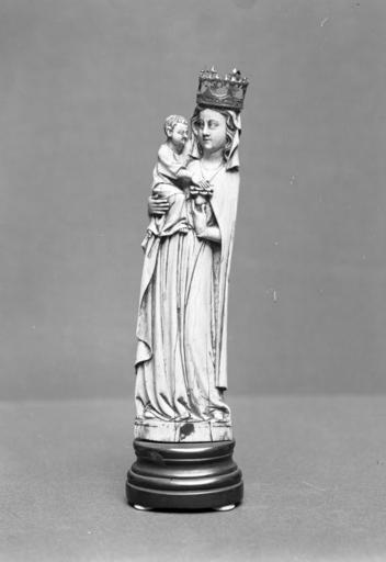 | Keywords: German - Virgin and Child - Walters 71153 (2).jpg The Virgin is carved from a thin curved piece of ivory backed with a fill of hardwood chestnut to stabilize the figure The tall Virgin wears a mantle that falls straight from her shoulders and offers a flower to the Child whom she holds with her right hand The crown which was of carved ivory is missing and the head is crosshatched to receive it There are traces of gilding in the hair and a gilt line across the raised base The Child's head has been broken and repaired with the original piece 2nd quarter 14th century Medieval ivory wood chestnut cm 19 5 accession number 71 153 35411 Marcus Antocolsky Paris date of acquisition unknown by purchase Sale Hotel Drouot Paris June 10 1901 no 72 Henry Walters city Baltimore Walters Art Museum Henry Walters Acquired by Henry Walters 1901 Medieval Art in America 1800-1940 Patterns of Collecting Palmer Museum of Art University Park 1995-1996 place of origin Middle Rhine Germany <gallery> File German - Virgin and Child - Walters 71153 jpg </gallery> Walters Art Museum license Medieval ivory in the Walters Art Museum German art in the Walters Art Museum Media contributed by the Walters Art Museum needs category review Sculptures of Madonna and Child |