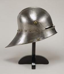 Keywords: German - Visoreal Sallet - Walters 51470 - Profile.jpg A work of art and a triumph of technology the long-tailed sallet was the characteristic German war helmet of the later Middle Ages This is a superb example The flowing profile of the neck defense and mirror-like polish of the hammered tempered steel could deflect the most formidable blows The visor could be raised to provide better vision and easier breathing It would have been used with a chin guard Its weight at 4 lbs 12 oz is considerably less than that of its Italian counterpart This sallet is from the Princes of Liechtenstein collection at Vaduz between 1480 1490 Renaissance steel iron cm 25 5 22 5 39 6 accession number 51 470 497 Liechtenstein Sale American Art Association New York November 19 1926 no 232 Henry Walters Baltimore 1926 mode of acquisition unknown Walters Art Museum Henry Walters Acquired by Henry Walters 1926 World of Wonder The Walters Art Gallery Baltimore 1971-1972 Highlights from the Collection The Walters Art Gallery Baltimore 1998-2001 place of origin Germany Walters Art Museum license Renaissance applied arts in the Walters Art Museum Armour in the Walters Art Museum Armour of Germany German art in the Walters Art Museum 15th-century helmets Sallets |