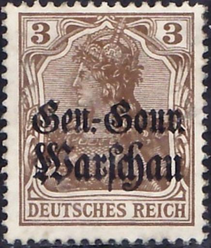 Keywords: Germania GenGouv 1916 3Pf B001.jpg Deutsche Besetzungsausgaben 1914/18 - Deutsche Post in Polen Germania-Motiv Friedensdruck 3 Pfennig braun mit zweizeiligem Aufdruck in Frakturschrift Gen -Gouv /Warschau German occupation stamps 1914/18 - German Post in Poland Germania motive freedom print 3 Pfennig brown with double-spaced overprint in Gothic print Gen -Gouv /Warschau Nominal value 3 Pfennig <br /> Watermark 1 standing rhombs scan of original other date 1916-08-01 issue of stamp Creator Paul Eduard Waldraff 1917 Philately Germania motive with double-spaced overprint in Gothic print Gen -Gouv /Warschau for the Generalgouvernement Warschau other date 1916-08-01 Deutsche Post in Polen Creator Paul Eduard Waldraff Reichsdruckerei Berlin letterpress K 14 14ΒΌ comb perforation Deutsche Besetzungsausgaben 1914/18 - Deutsche Post in Polen Michel No 7 overprint on Deutsches Reich Michel No 84I from 1905 Overprints on Germania stamps German stamps review keep 1916 stamps of Germany for Poland 07_1_1 |