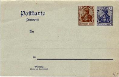 | Keywords: Germaniapostkarte1902.jpg The blank side of open letter of German empire with preprint of 3 and 2 pfennigs Germania stamps 1902 Отк ытка отк ытое письмо Ге манской импе ии с напечатанными 3- и 2-пфенниговыми ма ками се ии Ге мания типовая об атная сто она 1902 год own collection 2008-03-25 Creator Paul Eduard Waldraff Scanned by User Nickpo 1917 Postcards of Germany Germania stamps German stamps review keep 1902 stamps Postal stationery of Germany | ||||