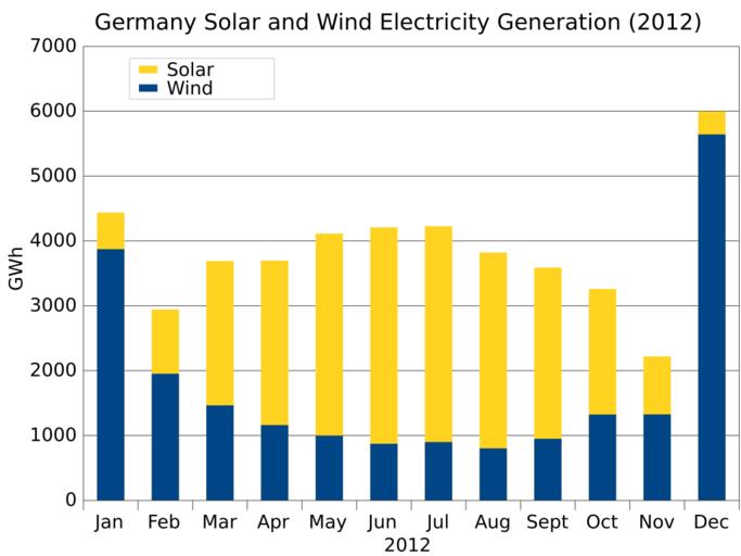 Keywords: Germany Electricity Generation from Wind and Solar Bar Chart-2012.svg translate yes en Comparison of wind power and solar power generated each month in Germany in 2012 showing that wind and solar are complementary There is more wind in the winter but there is more solar in the summer Data fromhttps //www entsoe eu/publications/statistics/monthly-statistics/Pages/default aspx 2014-06-15 own Delphi234 cc-zero 2012 in Germany Renewable energy statistics of Germany Uploaded with UploadWizard |