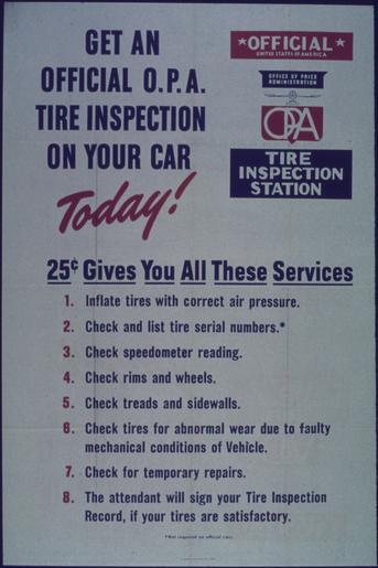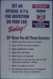 Keywords: "Get an Official OPA Tire Inspection on your Car Today" - NARA - 514354.tif Scope and content General notes 514354 Local identifier 44-PA-860 Office for Emergency Management Office of War Information Domestic Operations Branch Bureau of Special Services 03/09/1943 - 09/15/1945 Still Picture Records Section Special Media Archives Services Division NWCS-S National Archives at College Park 8601 Adelphi Road College Park MD 20740-6001 1941 - 1945 Record group Record Group 44 Records of the Office of Government Reports 1932 - 1947 Record group ARC 373 World War II Posters compiled 1942 - 1945 Series ARC 513498 File unit File unit ARC Variant control numbers NAIL Control Number NWDNS-44-PA-860 yes Other versions <gallery> File Get_an_Official_OPA_Tire_Inspection_on_your_Car_Today _-_NARA_-_514354 tif tif File Get_an_Official_OPA_Tire_Inspection_on_your_Car_Today _-_NARA_-_514354 jpg jpg </gallery> NARA-cooperation PD-USGov World War II posters about tires from the United States NARA TIF images with categorized JPGs Gas station signs in the United States Office of Price Administration |