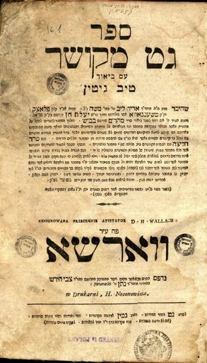 Keywords: Get Mekushar. Warsaw, 1815. First Edition.jpg en Get Mekushar with Tiv Gittin Order of the Get and Chalitza with elucidation by Rabbi Aryeh Leib Zinz Rabbi of Plotzk Warsaw 1815 First edition <br /> 89 1 10 leaves 34 5 cm <br /> Published by the author Mahara l Zinz The flyleaf features an old handwritten story 'Ma'ase Rokeich' in which the Ba'al HaRokeich visits his disciple in a dream Light tear with loss Owner stamps including one from Avraham Abish Margoliot of Radum possibly author of the Tzilusa D'Avraham <br /> LOT 466 in auction 25 2 15 3 Shatner Center 1st Floor Givat Shaul Jerusalem he גט מקושר ע כתב גיטין 49790331 https //il bidspirit com/portal/ lang en /lotPage/source/catalog/auction/54ae7d26e4b0df06286cfb31/lot/54c8de0de4b0e5a286c8a96f bidspirit com Aryeh Judah Leib ben Moses Teomim אריה ייב צינץ אריה ייב צינץ 1768-1833 1815 http //www hebrewbooks org/24579 PD-old-auto-1923 1833 Aryeh Leib Tzintz Title pages in Hebrew |