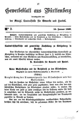 Keywords: Gewerbeblatt aus Wuerttemberg 1869 p17.png de à ber Wasserstraßen und ihr Verhältnis zu den Eisenbahnen In Gewerbeblatt aus Württemberg 1869 Seite 9-13 und 17-21 http //books google de/books pg PA18 dq kettenschifffahrt ei 7mSzTP2ELpHFswbXrZnYDQ ct result id RhM-AAAAcAAJ v onepage q kettenschifffahrt f false Wasserbau-Inspektor v Martens 1869 <gallery> File Gewerbeblatt_aus_Wuerttemberg_1869_p09 png 9 File Gewerbeblatt_aus_Wuerttemberg_1869_p10 png 10 File Gewerbeblatt_aus_Wuerttemberg_1869_p11 png 11 File Gewerbeblatt_aus_Wuerttemberg_1869_p12 png 12 File Gewerbeblatt_aus_Wuerttemberg_1869_p13 png 13 File Gewerbeblatt_aus_Wuerttemberg_1869_p17 png 17 File Gewerbeblatt_aus_Wuerttemberg_1869_p18 png 18 File Gewerbeblatt_aus_Wuerttemberg_1869_p19 png 19 File Gewerbeblatt_aus_Wuerttemberg_1869_p20 png 20 File Gewerbeblatt_aus_Wuerttemberg_1869_p21 png 21 </gallery> PD-old Chain ships Literature German Wikisource books Gewerbeblatt aus Württemberg 1869 |