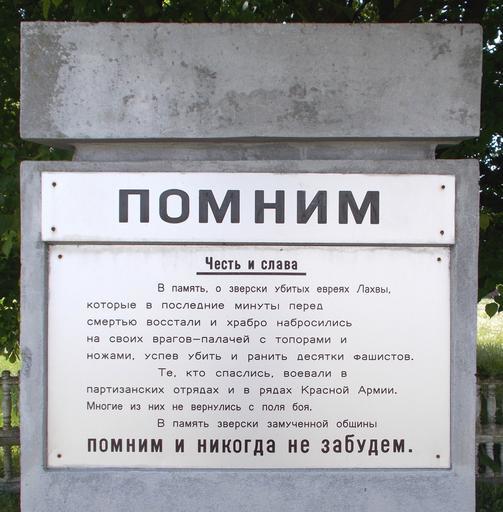 | Keywords: Ghetto Lakhva (Brest Region) 1c.jpg ru Памятник ев еям Лахвы восставшим в гетто п отив нацистов аходится на цент альной площади де евни 2014-05-10 10 41 51 own Avner 52 213162 27 101027 cc-zero Ghetto Lachva Luniniec District Uploaded with UploadWizard |