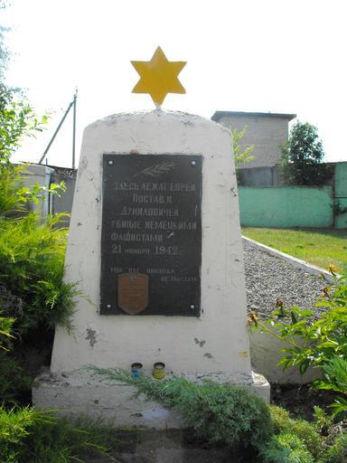 | Keywords: Ghetto Pastavy 2a.jpg ru Памятник на месте массового убийства ев еев Постав и Дуниловичей во в емена Холокоста аходится в Поставах на улице Ленинской бывшая Б аславская нап отив дома 145 на те ито ии ДРСУ-132 где во в емя войны был железнодо ожный пе еезд 2012-07-29 own Avner cc-zero Ghetto Pastavy Uploaded with UploadWizard |