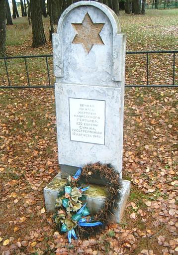 Keywords: Ghetto Surazh 1a.jpg ru Памятник ев еям гетто посёлка Су аж Витебская область убитым в августе 1941 года own А кадий Шульман 2006 Ghetto Suraž Cc-zero