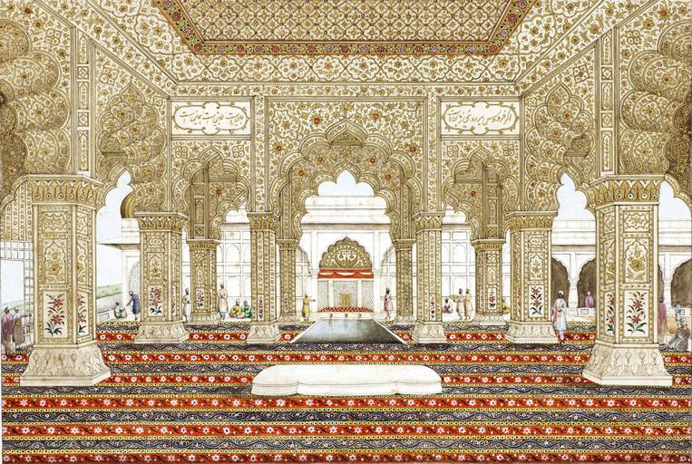 Keywords: Ghulam Ali Khan 014b.jpg The interior of the Dewan Khas - and the Tusbee Khana in the Red Fort A series of 31 paintings by Ghulam Ali Khan fl 1817-55 consisting of views of monuments in and around Delhi and including four portraits of the last Mughal Emperor Bahadur Shah II reg 1837-58 and his sons Watercolour and gold on paper black margin rules three title pages three sheets of portraits all with identifying inscriptions in English and in Persian in nasta'liq script in black ink the portraits with further inscriptions in nasta'liq script with the date November 1852 Christian date written in Arabic in later mounts loose in contemporary green leather-covered despatch box the lid embossed in gold DELHEE 1854 Size paintings 290 x 215 mm and slightly smaller; mounts 318 x 394 mm ; box 435 x 365 x 110 mm File Ghulam Ali Khan 014 jpg circa 1852 1854 Ghulam Ali Khan PD-Art-100 Diwan-i-Khas Red Fort Red Fort in art |