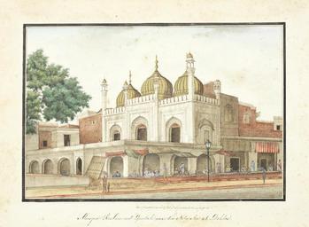 Keywords: Ghulam Ali Khan 026.jpg Masjid Roshun ood Daulah near the Kotuabe at Delhee The Sunehri Masjid Golden Mosque of Roshan ud-Dawla at Chandni Chowk near Kutwali in Delhi A series of 31 paintings by Ghulam Ali Khan fl 1817-55 consisting of views of monuments in and around Delhi and including four portraits of the last Mughal Emperor Bahadur Shah II reg 1837-58 and his sons Watercolour and gold on paper black margin rules three title pages three sheets of portraits all with identifying inscriptions in English and in Persian in nasta'liq script in black ink the portraits with further inscriptions in nasta'liq script with the date November 1852 Christian date written in Arabic in later mounts loose in contemporary green leather-covered despatch box the lid embossed in gold DELHEE 1854 Size paintings 290 x 215 mm and slightly smaller; mounts 318 x 394 mm ; box 435 x 365 x 110 mm http //www bonhams com/auctions/20833/lot/352/ circa 1852 1854 Ghulam Ali Khan 100px PD-Art-100 Sketches of The Delhee Palace Delhee 1854 |