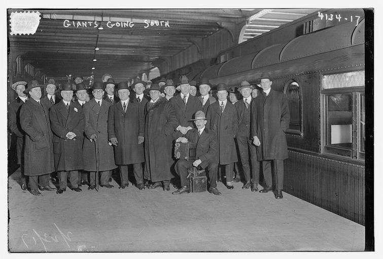 Keywords: Giants going South (LOC) (16271342197).jpg Bain News Service publisher Giants going South 1917 date created or published later by Bain 1 negative glass ; 5 x 7 in or smaller Notes Title from data provided by the Bain News Service on the negative Forms part of George Grantham Bain Collection Library of Congress Subjects Baseball Format Glass negatives Rights Info No known restrictions on publication Repository Library of Congress Prints and Photographs Division Washington D C 20540 USA http //hdl loc gov/loc pnp/pp print hdl loc gov/loc pnp/pp print General information about the Bain Collection is available at http //hdl loc gov/loc pnp/pp ggbain hdl loc gov/loc pnp/pp ggbain Higher resolution image is available Persistent URL http //hdl loc gov/loc pnp/ggbain 23778 hdl loc gov/loc pnp/ggbain 23778 Call Number LC-B2- 4134-17 https //www flickr com/photos/library_of_congress/16271342197/ Giants going South LOC LOC-image ggbain 23778 https //www flickr com/people/8623220 N02 The Library of Congress http //www loc gov/rr/print/195_copr html noknown The Library of Congress Flickr Commons PD-Bain The Library of Congress http //flickr com/photos/8623220 N02/16271342197 2015-02-15 02 52 41 pd
