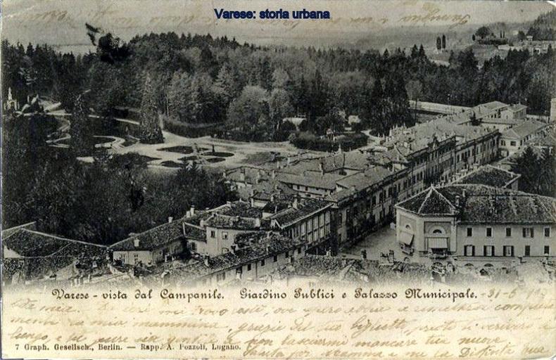 In basso la strettissima via Verbano, subito dopo, affianco a Palazzo Estense (arch. Giuseppe Antonio Bianchi, 1766-73), la casa Sacco/Ghirlanda (arch. Francesco Peverelli, 1808) sostituita nel 1964 dal palazzo della Banca d'Italia (arch. Ignazio Gardella). Di fronte la casa ad angolo che ospita l'albergo Europa (1855). In fondo a Palazzo Estense la filanda costruita nel 1837 e abbattuta nel 1932. Non appare ancora l'edificio multipiano della scuola media che venne costruito nel 1903 e abbattuto negli anni '70. Si sorge all'angolo di via Verdi la portineria di villa Baroggi (ing. Giacomo Cova, 1890) ora scomparsa. In alto a destra una rarissima immagine del parco di villa Quiete dei Sanvito (ex convento dei cappuccini ed ora sede del liceo classico). varese giardinipubblici palazzoestense |
