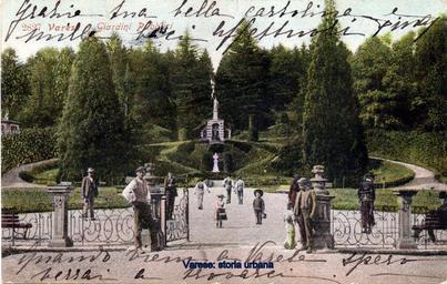 Keywords: Immagine di inizio XX secolo. Dietro la fontana centrale la statua di Umberto I. La fontana superiore, il "grottesco" (1767-69) è sormontata dalla statua dell'Italia liberata. All'estrema sinistra è visibile un angolo della costruzione che ospitava il deposito delle carrozze ducali (non più esistente). varese giardinipubblici |