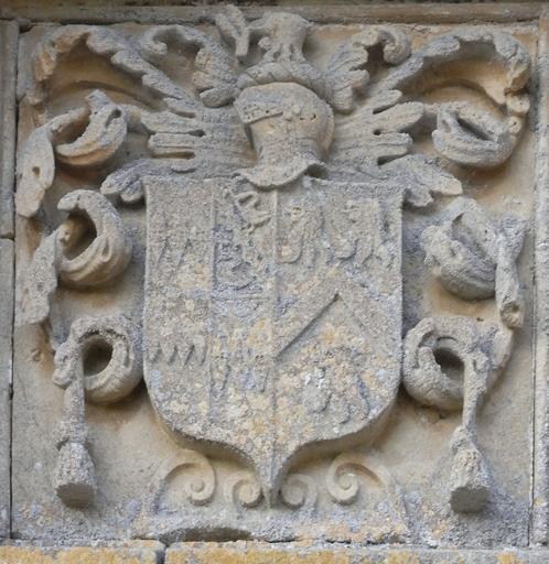 Keywords: GiffardArmsBrightleyBartonPorchDevon.JPG en Sculpted stone heraldic escutcheon above porch Brightley Barton Devon showing arms of Giffard impaling Wyndham Atop the helm is the crest of Giffard A cockrel's head erased in its beak an ear of wheat The arms of Giffard 1st 4th Sable three fusils conjoined in fesse ermine for difference a crescent in chief argent quarter Coblegh 2nd Gyronny of eight gules and sable between two cobs i e male swans argent on a bend engrailed of the last three hurts and de Brightley FitzWarin 3rd Gules on a chief indented argent a mullet of the first These arms can be seen more clearly sculpted on the mural monument in Tiverton Church of Roger Giffard d 1603 own photo own photo 2012-05 Chittlehampton Sculptures in Devon FitzWarin arms Wyndham arms Giffard arms Coblegh arms |