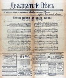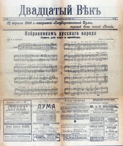 Keywords: Gimn izbrannikam naroda.jpg ru Газета Двадцатый век от 27 ап еля 1906 года 1906-04-27 http //www zaksobr-chita ru/parlamentarizm/gimn-izbrannikam-russkogo-naroda--1906g---slova-n--sokolova--muzyka-a--glazunova--zapis--1993-g- Редакция газеты Двадцатый век Авто ы гимна на пе едовице - композито А Глазунов поэт Соколов Custom license marker 2013 06 12 PD-RusEmpire Uploaded with UploadWizard Newspapers of Russia 1906 Newspapers of Russia to be categorised by name