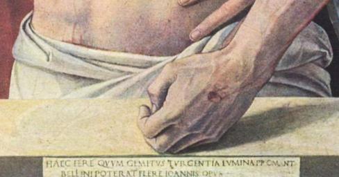 Keywords: Giovanni bellini, pietà, dettaglio.jpg artwork langswitch Dead Christ Supported by the Madonna and St John Halott Krisztus Szűzanya és Szent János <br> detail tempera panel - HA caption lowercenter Pinacoteca di Brera Milan Yorck creator Giovanni Bellini c 1465 PD-old-100 PD-Art-YorckProject Latin inscriptions in Milan Pietà di Brera by Giovanni Bellini |