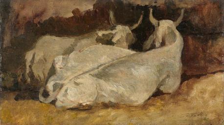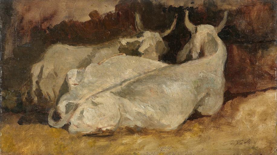 Keywords: Giovanni Fattori Liegende Kühe.jpg Liegende Kühe Gio Fattori signature langswitch old sticker with number by artist altes Klebeetikett mit Nummerierung des Künstlers oil on canvas 19 x 33 cm http //www dorotheum com Dorotheum by 1908 Creator Giovanni Fattori PD-old-100 Images from Dorotheum Giovanni Fattori Paintings of cows |